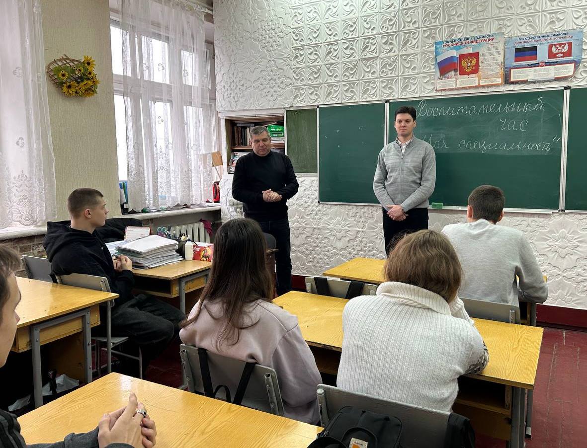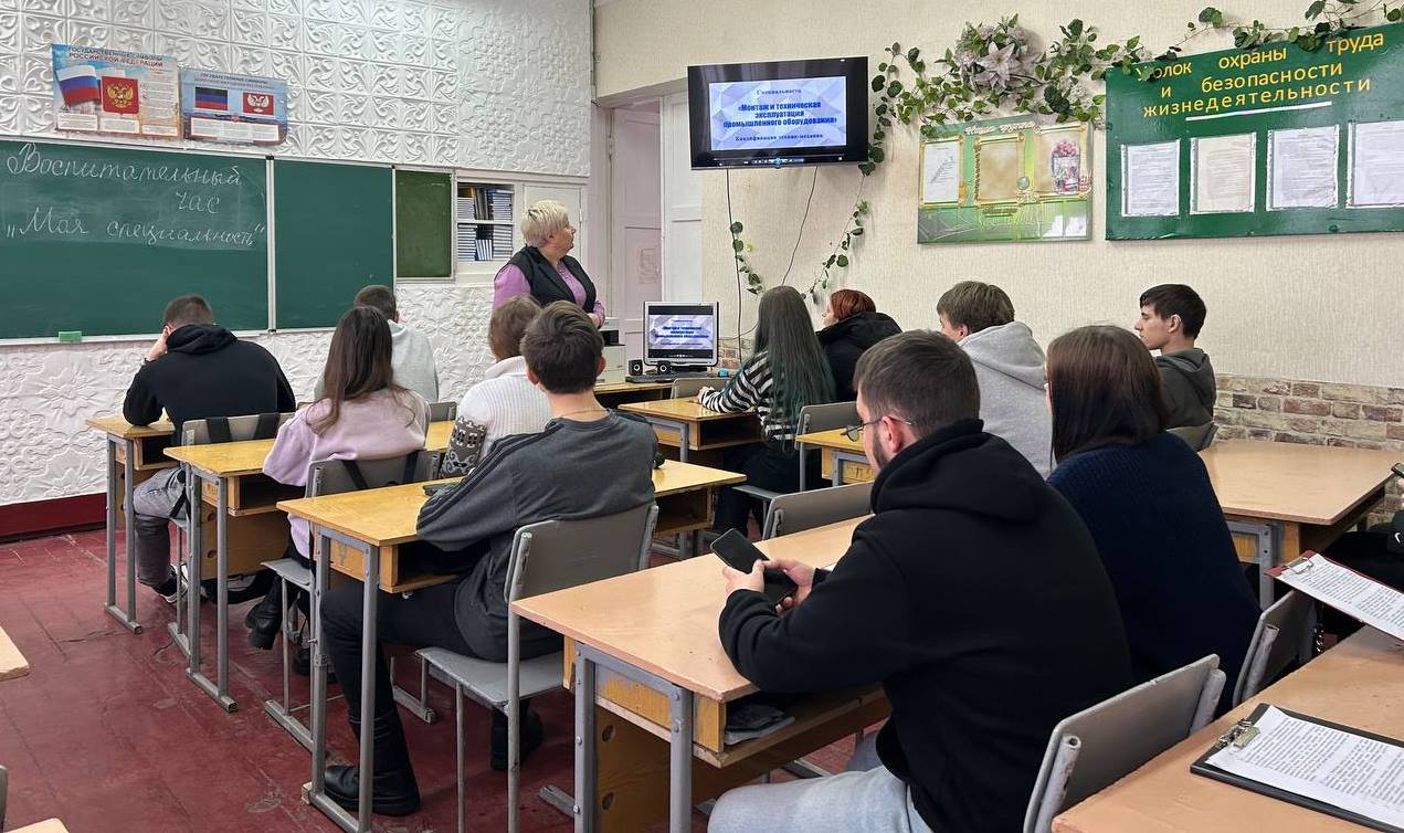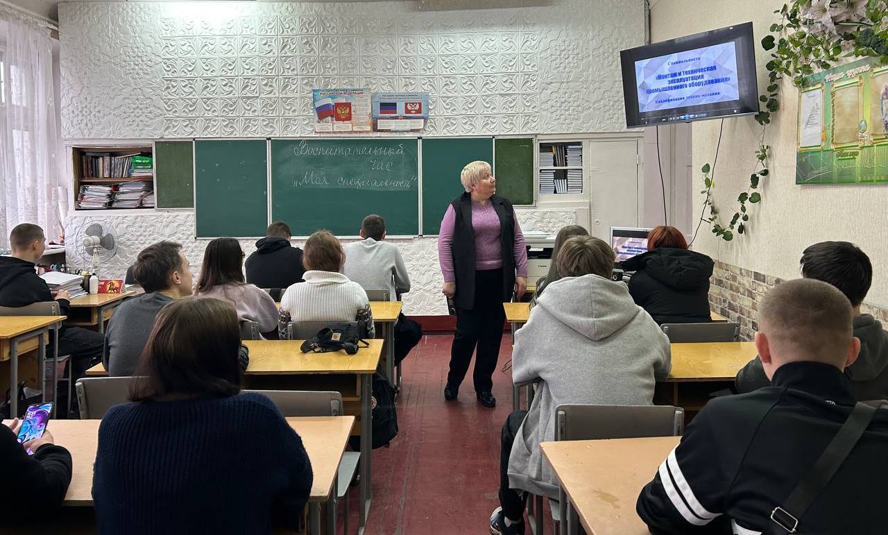 19.02.2026 в ГБПОУ «Снежнянский техникум промышленности и сферы услуг» в рамках декады цикловой комиссии общепрофессиональных и машиностроительных дисциплин преподавателем Тимофеевой Т.В. проведён воспитательный час на тему «Моя специальность». В мероприятии приняли участие обучающиеся 3-4 курсов специальностей «Монтаж и техническая эксплуатация промышленного оборудования (по отраслям)», «Технология машиностроения» и «Техническая эксплуатация и обслуживание электрического и электромеханического оборудования (по отраслям)» с участием представителей базового предприятия ОП «ПК» «Снежнянский машиностроительный завод» АО «ОДК-Климов»: заместителя руководителя по персоналу Роженко И.Ю. и главного технолога Лебеденко В.А..