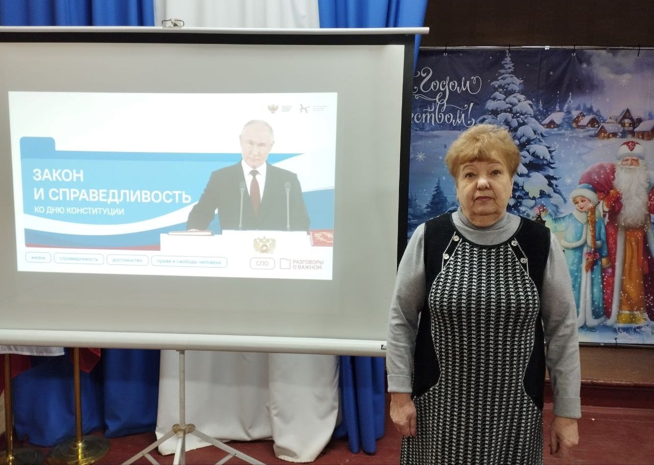 Внеурочное занятие на тему: "Закон и справедливость", приуроченное ко Дню Конституции Российской Федерации, провела преподаватель истории В.В. Филоненко.