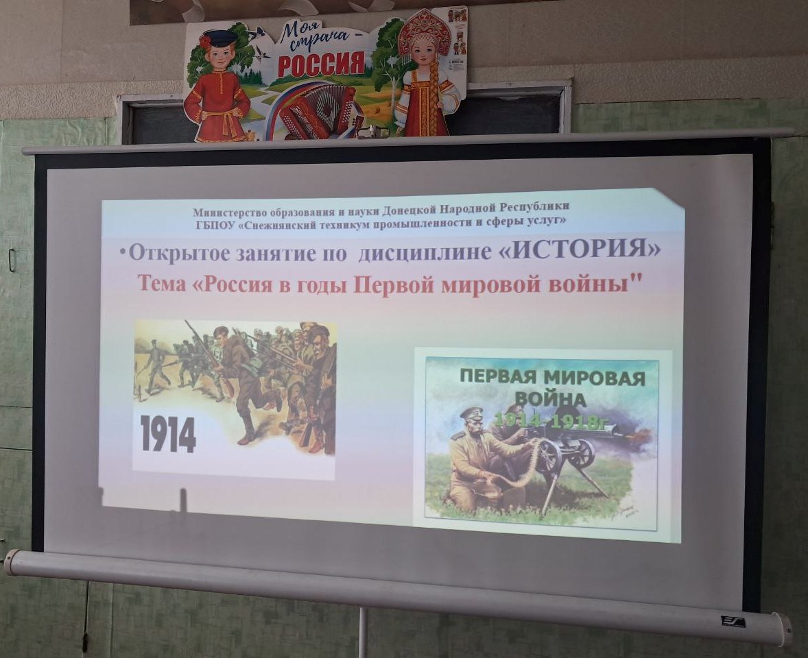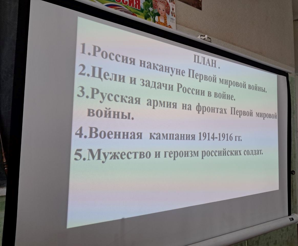 Во время проведения занятия использовались интерактивные методы обучения. Обучающиеся изучили события, в которых Россия непосредственно принимала участие, узнали о подвигах, мужестве и героизме русских солдат. Ребята высказали свое отношение к этим событиям. Война 1914-1918 г была одной из самых кровопролитных войн, прошедших на Земле, которую развязали крупнейшие капиталистические державы в начале XX века. Первая мировая война была чужда для народов России и других стран мира.