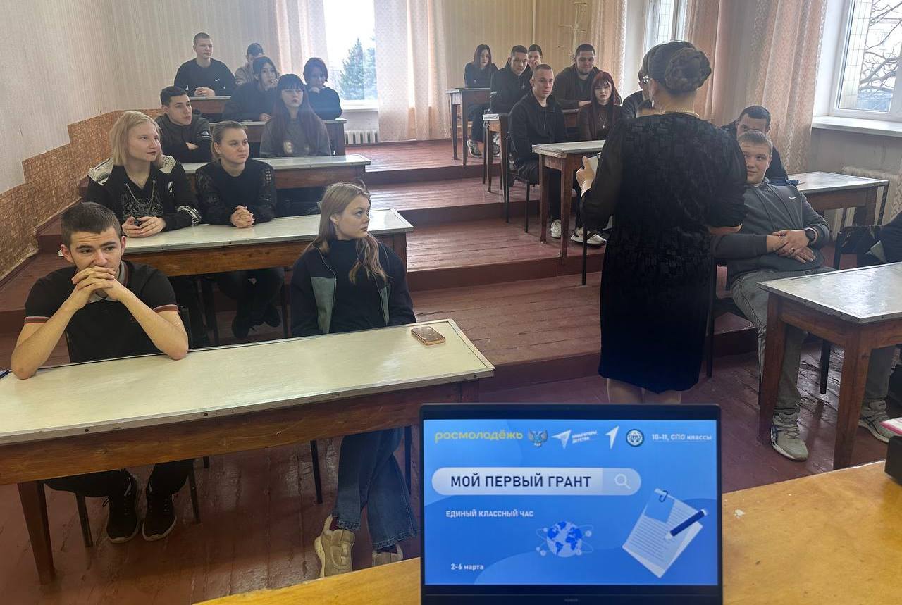 Советник директора по воспитанию О.Н. Калюжная в рамках занятия познакомила студентов с возможностями грантовых конкурсов для молодежи, таких как Росмолодёжь. Гранты и проекты «Движения Первых».